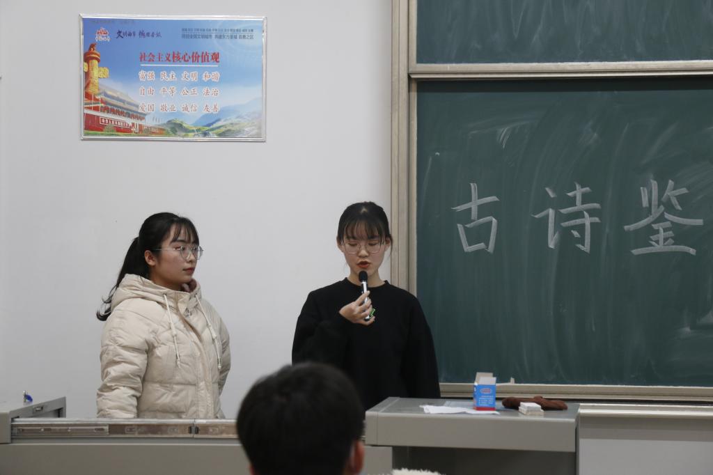 活动开始,主持人宣读本次活动的开幕词,介绍了比赛规则。随后,19组参赛选手按抽签顺序上台进行诗词鉴赏分享。选手们声情并茂地朗读了古诗词,对所诵读的古诗分别从思想内容、情感 、情态、语言几个方面进行了赏析,表达出诗词所表达的情感以及带给后世的影响。参赛选手们深情讲述着古诗背后的故事,使同学们身临其境,感受到了诗句所包含的深切情感,赢得了阵阵掌声。