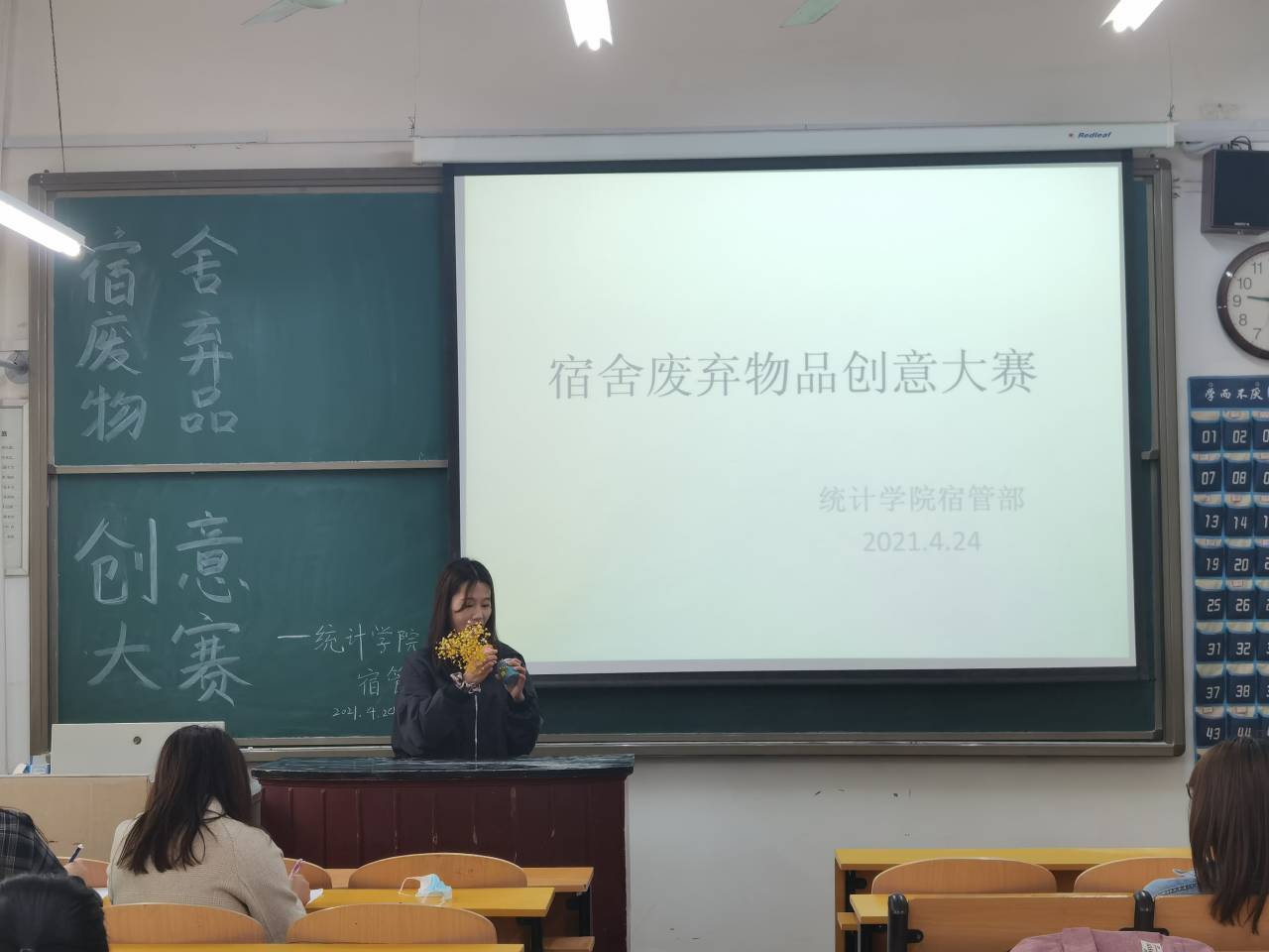 此次宿舍文化节包括宿舍风采大赛和宿舍废弃物品创作大赛两部分内容,宿舍风采大赛于4月21日举办,参加活动的寝室在宿舍准备好“寝室铭”、舍标以及舍歌,由宿管部成员进入寝室进行评比和拍照,参考内务标准、创意性与美观性,依照评分细则对参赛宿舍打分。各宿舍踊跃参加,积极地展现了优美的宿舍环境以及和谐的宿舍氛围。宿舍废弃物品创作大赛于4月24日上午9:00举行,参赛的同学们提前带作品至比赛场地并准备一到两分钟的作品讲解,由宿管部成员部门成员进行评比。同学们积极参加,大胆展示自己的想法,讲解生动活泼,现场气氛活跃。