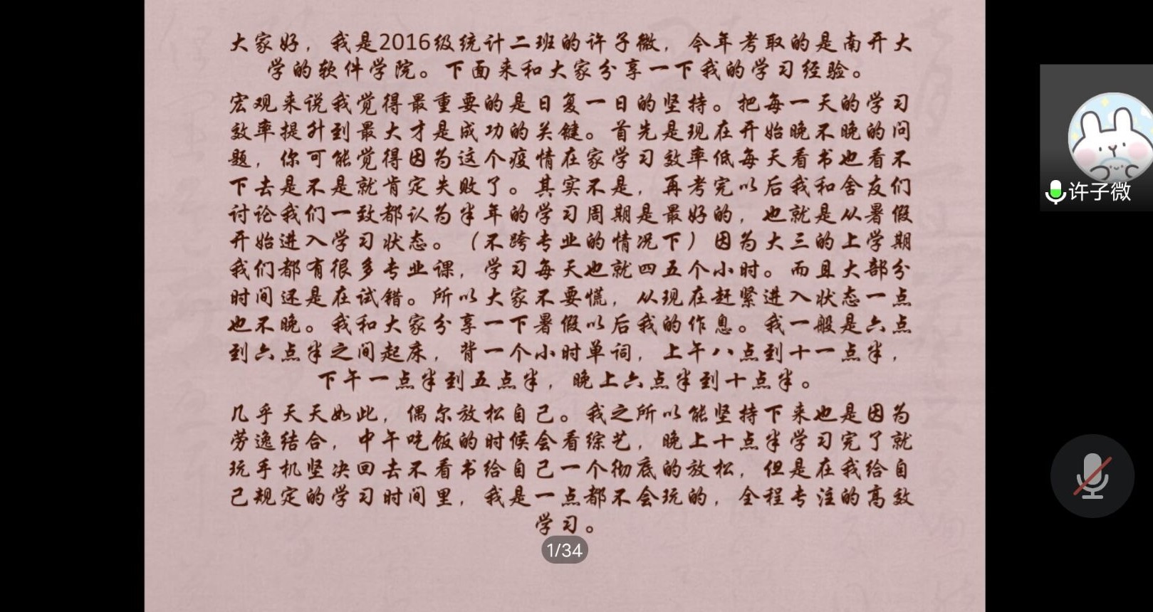 学风建设,使同学们对考研有更多的了解认识。6月5日下午两点,统计学院学习部通过腾讯会议在线组织举办“群英聚首,剑指研峰”线上考研经验交流大会。本次会议特邀2016级考研成绩优异的9位同学:许子微、陈晨、黄婧茹、潘淑霞、王梦、袁庆颖、张轲、朱蒙蒙以及仲昭慧进行经验分享和指导。17级、18级、19级共110余人到会聆听。