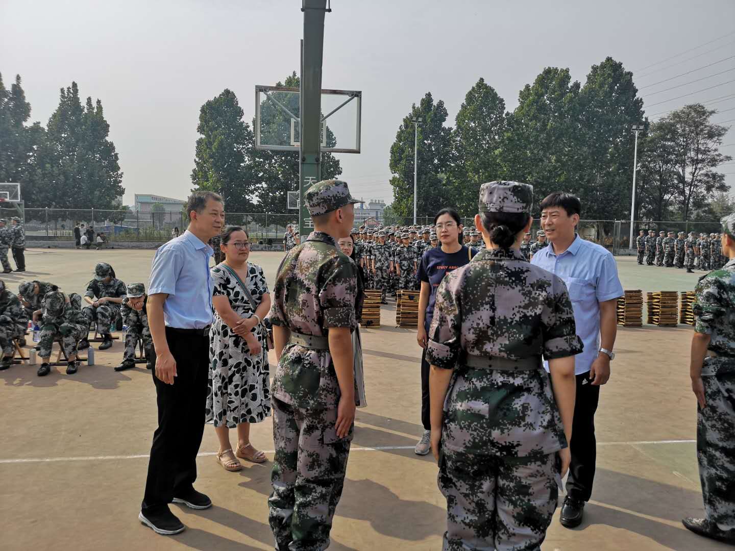 新生军训第一天,统计学院党委书记刘明海、党委副书记季中、团委书记李宴美、18级辅导员张风姣、20级辅导员张庆伟,到西操场查看2020级新生军训情况,关注新生身体问题,询问教官新生表现情况。教官现场指导新生摆放马扎、水杯,练习站军姿,学院领导对认真学习的同学们表示称赞,并鼓励同学们要认真对待军训,努力完成军训任务。