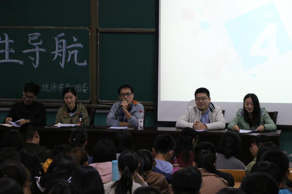 10月22日下午7点,由统计学院团委主办、学生会学习部承办的2017级新生导航活动在统计学院教学楼成功举办,班主任王明秋老师,学生会主席团成员,全体2017级新生参加了此次活动。