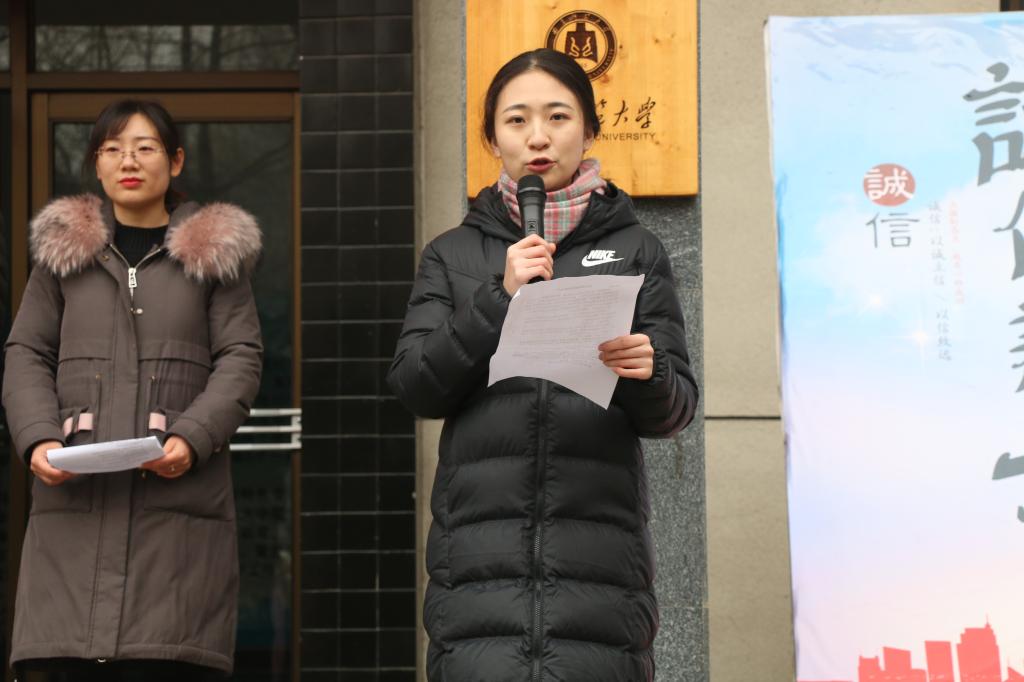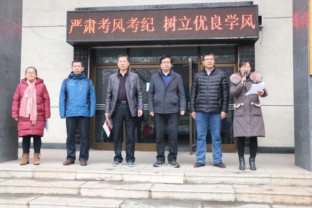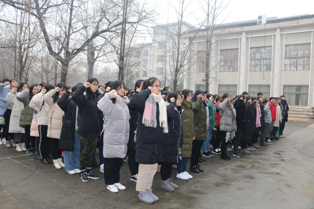 于1月4日下午在统计学院楼前召开2018-2019学年期末考风考纪诚信动员大会。出席大会的有统计学院党委书记刘明海、院长尹传存、副院长赵胜利、院长助理赵翔华、团委副书记李玲以及辅导员李宴美老师,2016级至2018级全体学生参加本次大会。
