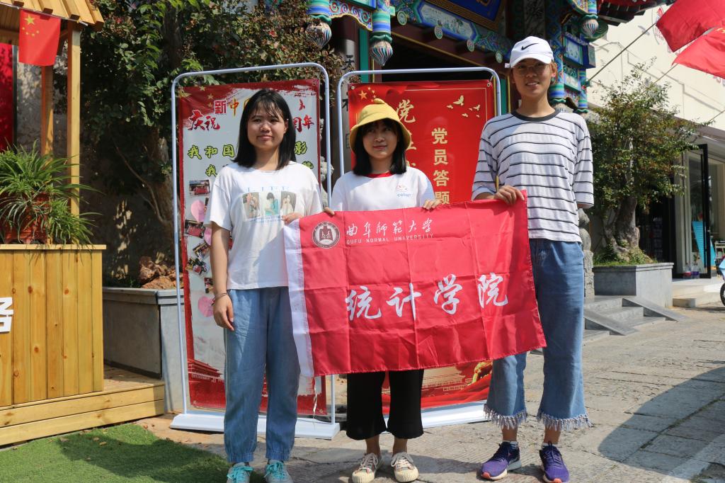 活动现场气氛活跃,途径天福园的游客们通过APP软件鉴定党员身份,随机抽题,答题,根据答对数目相应颁发奖品,最后游客与国旗合影留念。统计学院志愿者们表现积极,热情高涨,为游客们端送热水,批改答题试卷,受到了一致好评。
