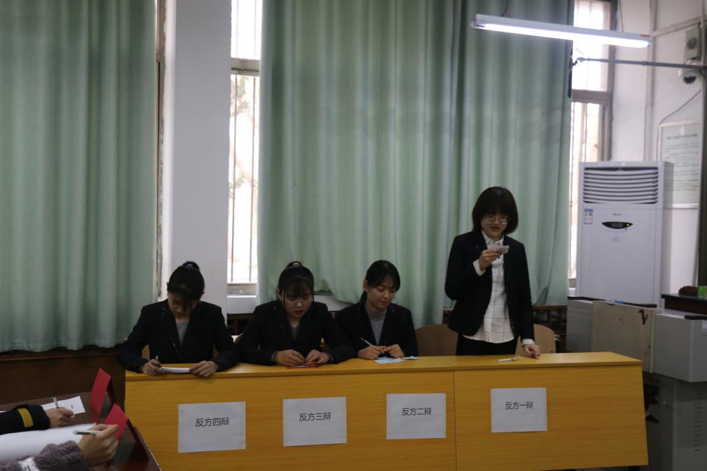 经过层层的选拔和激烈的角逐,两队辩手脱颖而出,来到决赛的现场。决赛以“当代社会女性更需要关怀还是男性更需要关怀”为辩题展开辩论。首先,双方辩手分别提出自己的观点,辩论过程中,双方队友态度坚定、慷慨激昂,全力维持自己的观点。辩手们思路清晰,妙语连珠,他们敏捷的思维、精彩的辩论令观众为之折服,赢得阵阵掌声。最后,经过评委们的提问及点评,正方“当代社会,男性更需要关怀”获得最终胜利,正方三辩苗淑伟同学获得“最佳辩手”称号。