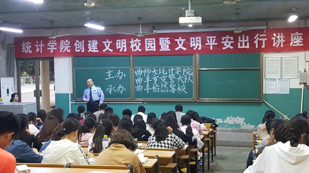 为贯彻学校深化文明校园创建工作动员大会精神,倡导文明出行,提高学生的防诈骗能力,由统计学院和曲阜市公安局交警大队主办、曲阜市怡然驾校承办的“统计学院创建文明校园暨平安文明出行知识讲座”于5月22日在数学科学学院楼101室成功举办。统计学院党委副书记季中,曲阜市公安局交警大队警官孔建军、曲阜市怡然驾校董事长孔磊、校长张来臣出席了本次知识讲座,统计学院大一大二约150名学生参加了本次知识讲座。