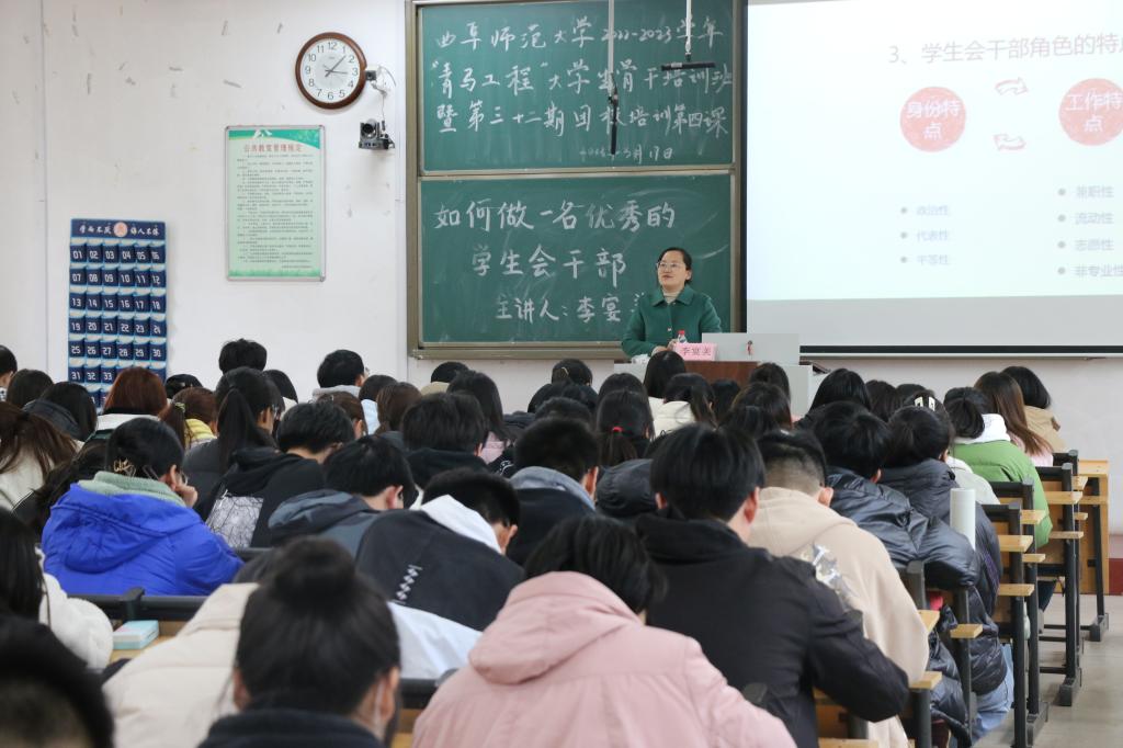 2022—2023 学年“青马工程”大学生骨干培训班暨第三十二期团校培训第四课,本次培训由学院团委书记李宴美老师主讲,学院学生党员、积极分子、各年级班长团支书、团委和学生会成员参加此次会议。