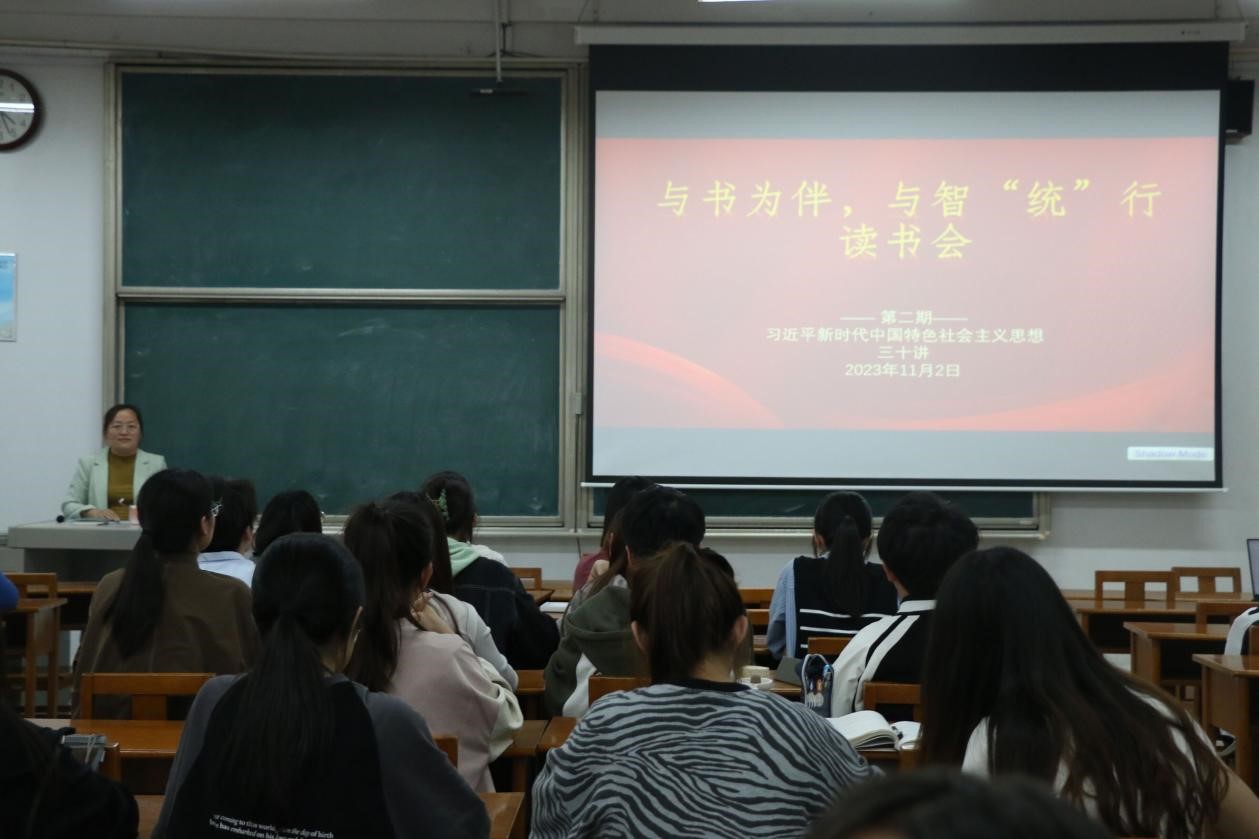 于11月2日下午16:00在综合楼203举行“与书为伴,与智‘统’行”学习读书会第二期,本次读书会主题为习近平新时代中国特色社会主义思想三十讲。团委书记李宴美出席本次活动,团委副书记娄力钧主持,学生会各部门部长参加。
