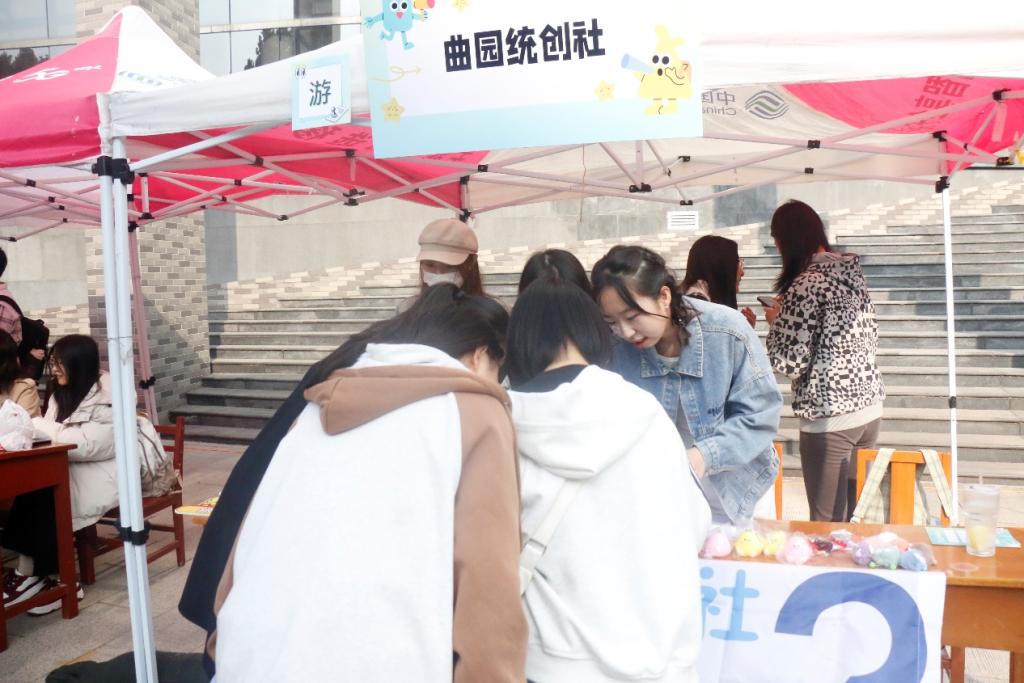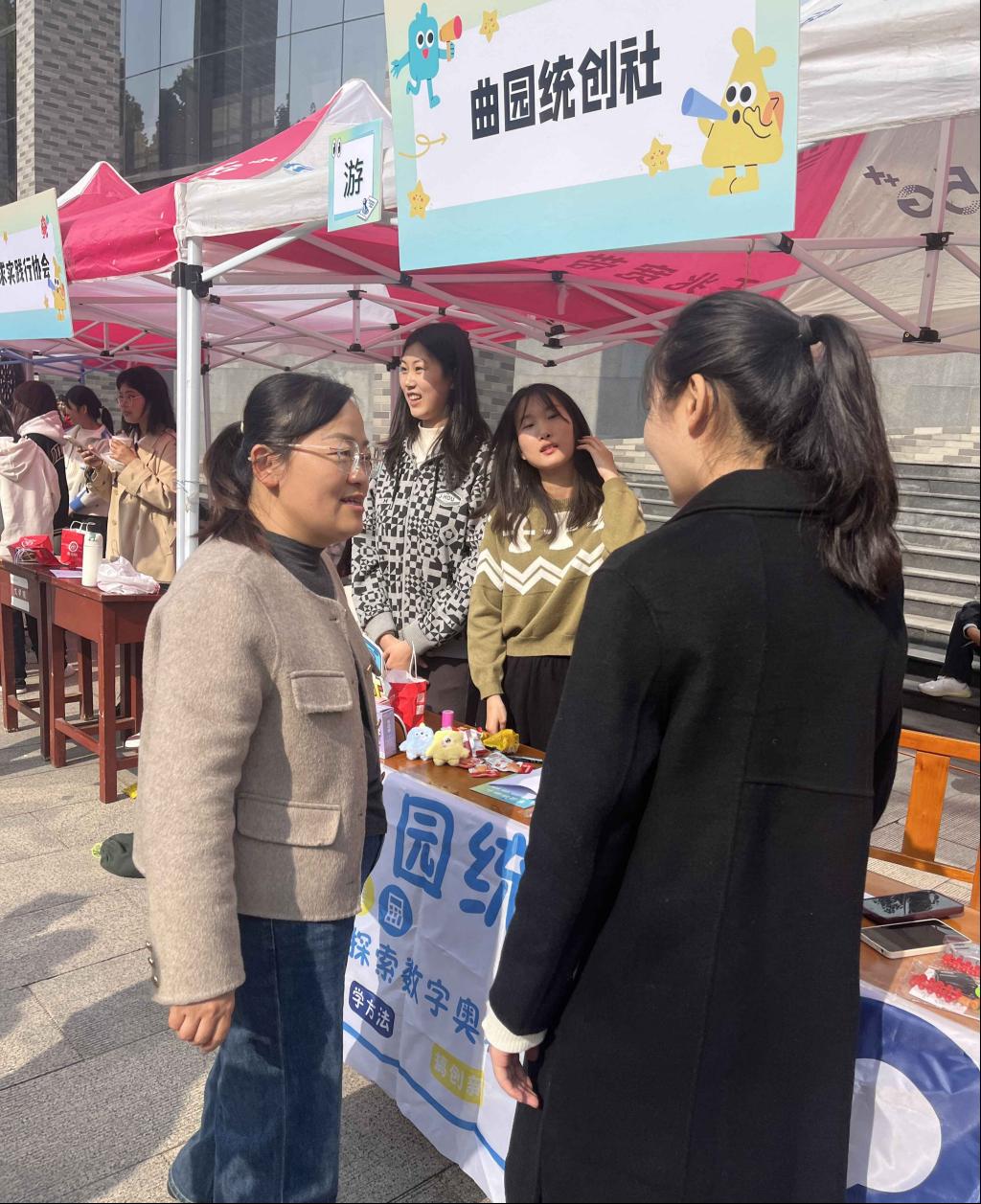 于 11 月 3 日在大学生活动中心前举办百团大战——社团纳新活动。曲园统创社、统计学社、家教协会面向全校同学招新,吸引了大批学生踊跃报名,学院团委书记李宴美来到现场为疯av