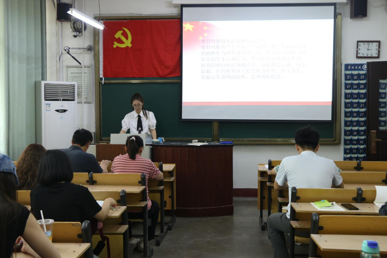 会议第一项,李宴美老师带领各位党员和预备党员深入学习了反腐败斗争的新情况新动向,她强调对腐败问题产生的土壤和条件要有清醒认识,以永远在路上的坚韧和执着,精准发力、持续发力,坚决打赢反腐败斗争攻坚战持久战。李宴美老师指出,各位同学要坚持不懈学习习近平新时代中国特色社会主义思想,认真学习贯彻落实习近平总书记的重要指示精神。随后,李宴美老师详细阐述了新征程反腐败斗争的具体做法,明确指出反腐败斗争的重要性,为各位党员和预备党员理解习近平总书记的重要讲话精神提供了理论支撑。