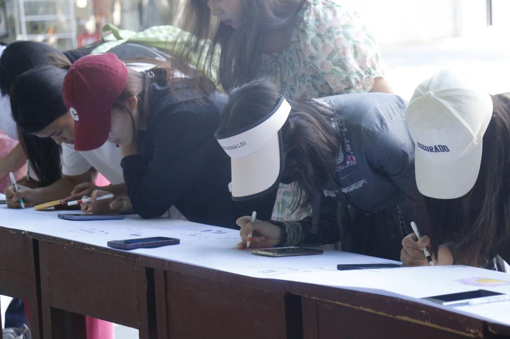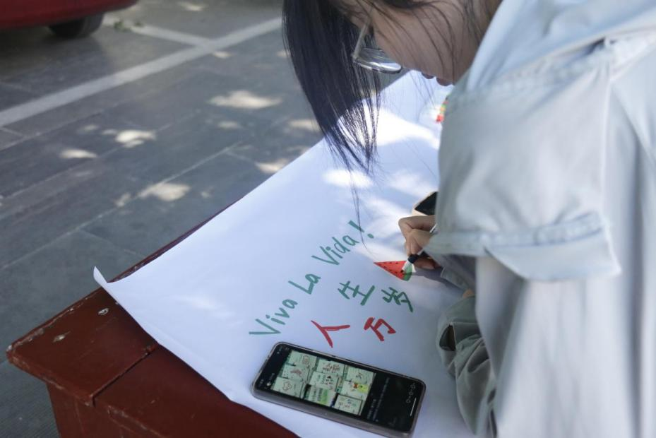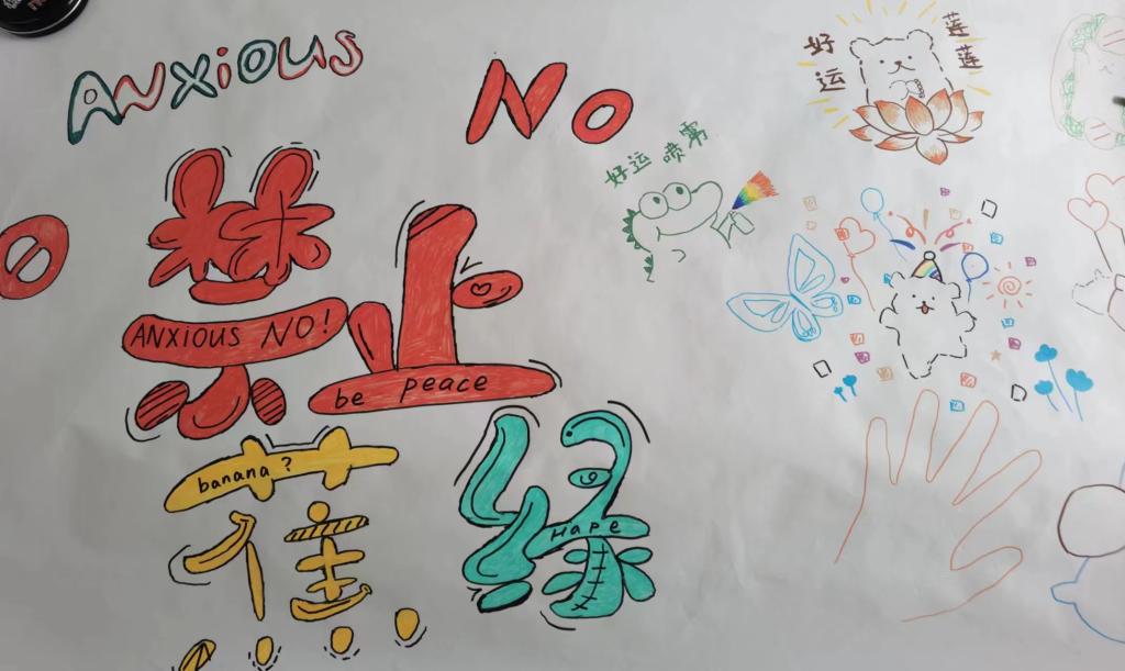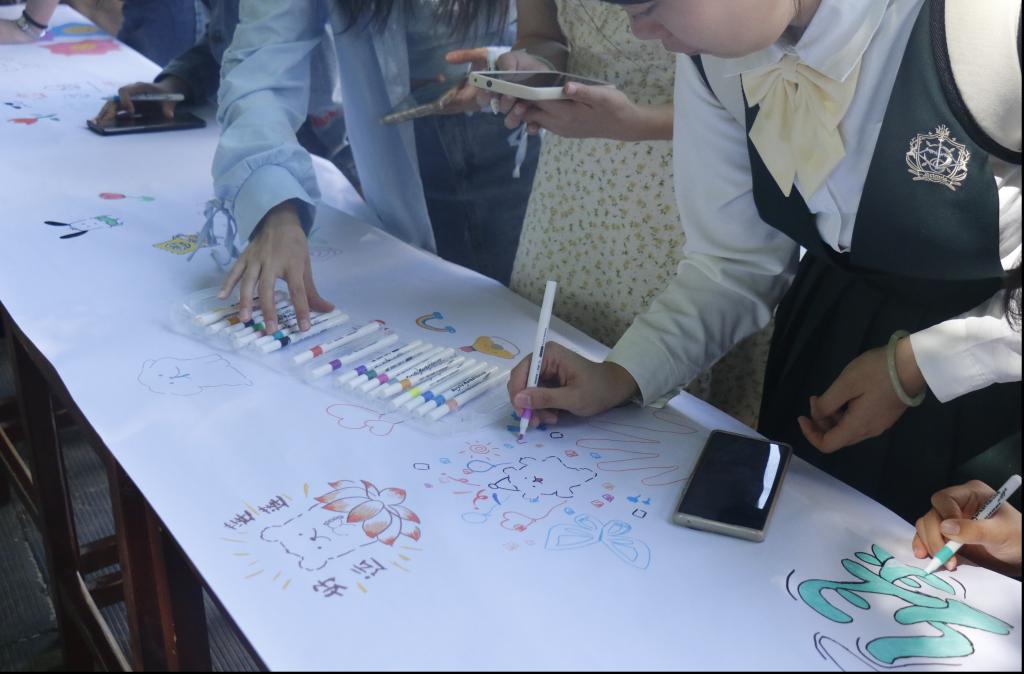 活动现场,参与者积极配合,在绘画长卷上共同绘画创作涂鸦墙。同学们共同用手中的画笔在洁白的画卷上挥洒创作,色彩斑斓的笔墨在画卷上流淌,一幅幅充满个性与活力的作品逐渐呈现,将原本单调的白卷装点得绚丽多彩。“禁止蕉绿”“好运莲莲”“人生万岁”等富有活力的配语,描绘了同学们健康向上的积极心态和乐观快乐的阳光愿景,彰显了同学们昂扬向上的青春与活力。