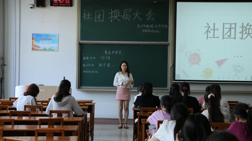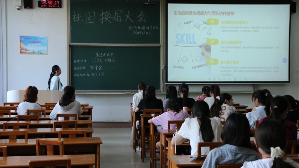 本次会议由社团管理部成员韩佳琪主持,首先三个社团现任社长对过去一年的工作做出了总结,家教协会社长苏苗凤对社团举办的活动进行了总结,并对未来的社团工作提出了期望;统计学社社长孙如惠强调了社团对于学生的重要作用,并希望社团在未来的工作中也能帮助其他学院学生认识到统计学的魅力;统创社社长徐菲悦对社团成员一直以来的辛勤工作表示感谢,并强调了各部门之间协作团结对社团发展的重要性。