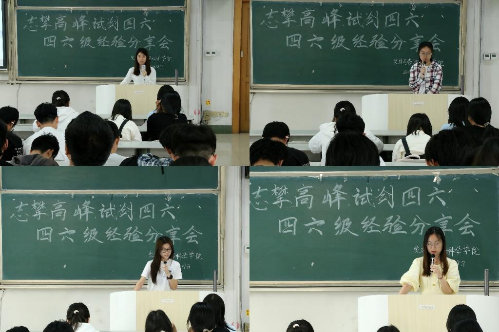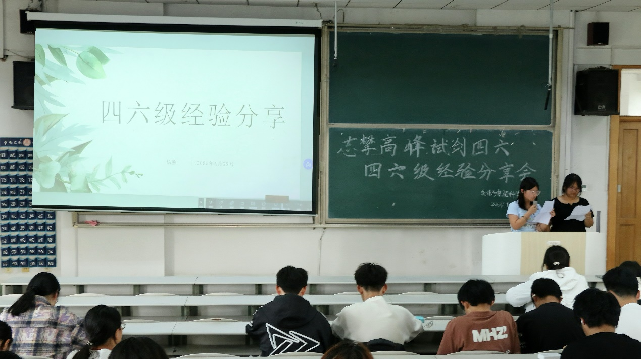 于2025年4月29日在综合楼506举办了四六级经验分享会。本次分享会由2023级岳佳璇、李浩锦、杨煦、赖欣怡四位学生代表主讲,2024级全体学生参与。