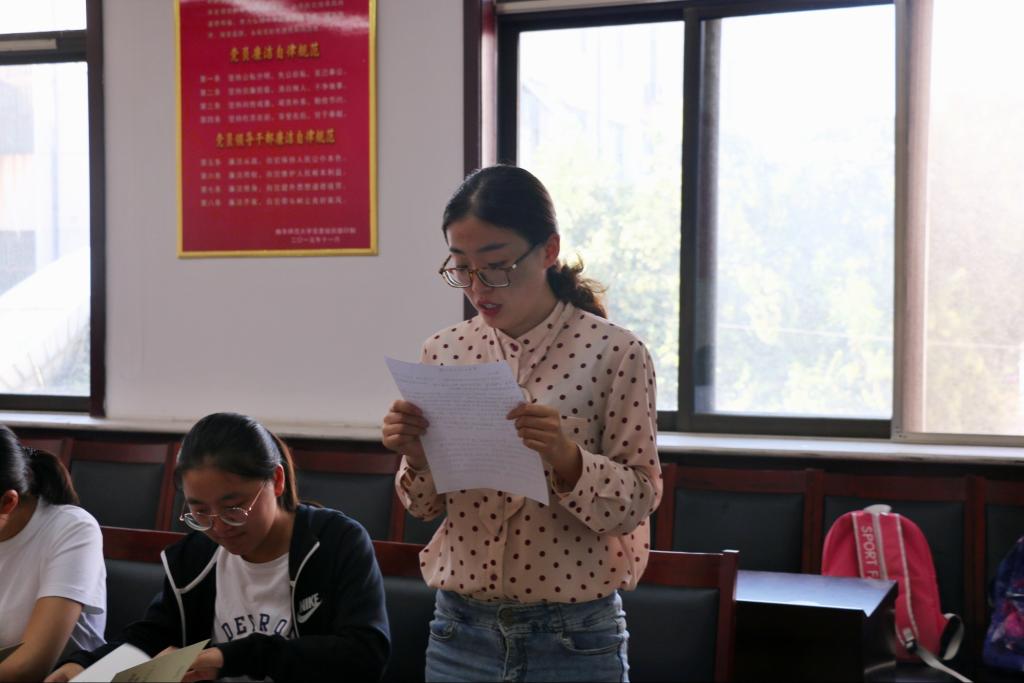 与会党员纷纷就近期自己的主题教育学习情况发言,张庆伟老师表示,她将突出党性修养,彰显辅导员形象;突出业务素质,打造过硬业务能力;突出职业操守,发挥先锋模范作用。她表示辅导员要切实提高自己的办事、撰写、宣讲、感染能力,以身作则将宣传作用发挥到极致,做“不忘初心、牢记使命”主题教育工作的主力军。张雨萍表示她将“不忘初心、牢记使命”,增强担当意识,敢于负责。韩潇表示“学习是成长进步的阶梯,实践是提高本领的途径”,大学生应把学习作为首要任务,勇于创新创造,未来为祖国贡献一份力量。