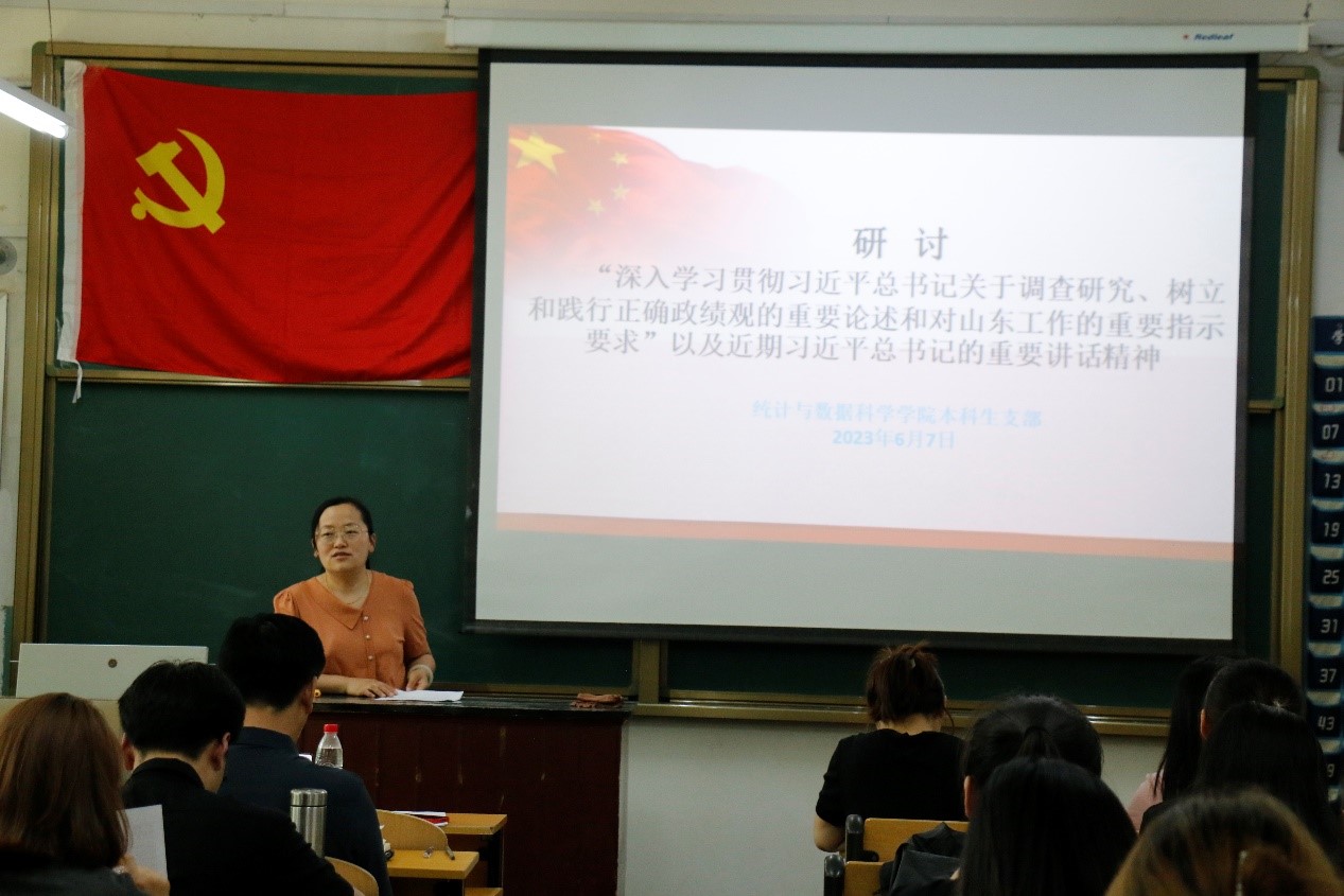 会议上, 李宴美老师带领各位党员和预备党员围绕“深入学习贯彻习近平总书记关于调查研究、树立和践行正确政绩观的重要论述和对山东工作的重要指示要求”这一主题以及近期习近平总书记的重要讲话精神进行集中学习研讨。李宴美老师强调,各位同学要坚持不懈学习习近平新时代中国特色社会主义思想,认真学习贯彻落实习近平总书记的重要指示精神。随后,李宴美老师详细阐述了习近平总书记对山东工作的重要指示要求具体内容,明确指出调查研究和树立正确政绩观的重要性,为各位党员和预备党员理解习近平总书记的重要讲话精神提供了理论支撑。