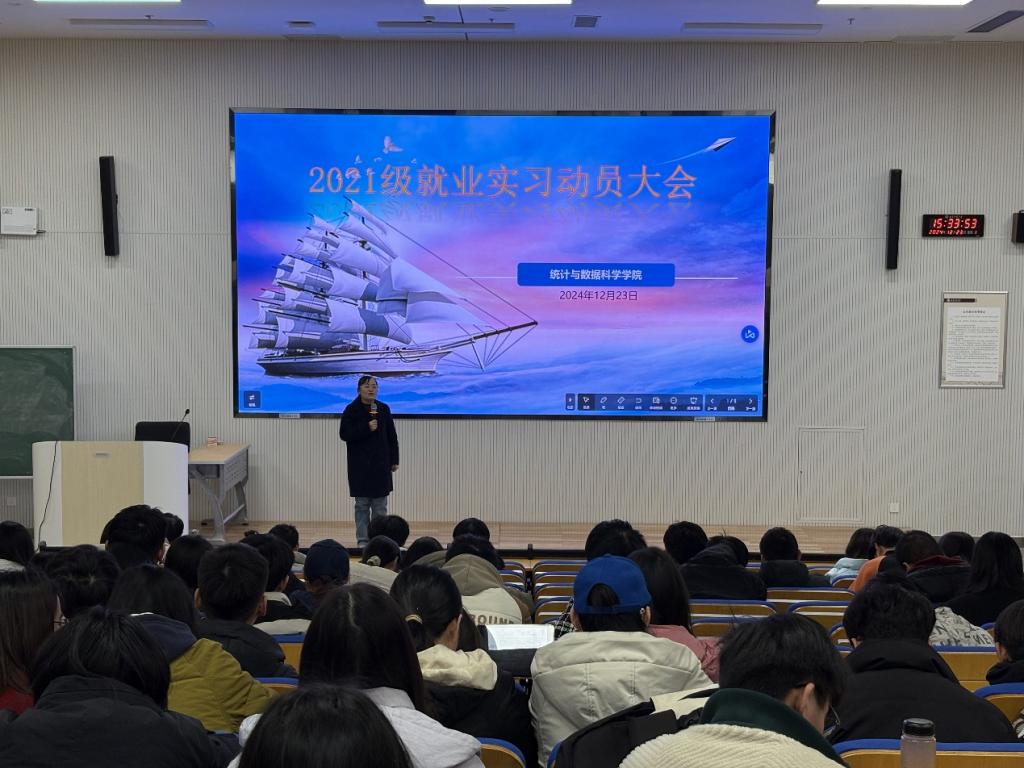 于2024年12月23日下午在致知楼201成功举办了2021级就业实习动员大会,副院长赵翔华、团委书记李宴美出席会议,21级全体同学参加。