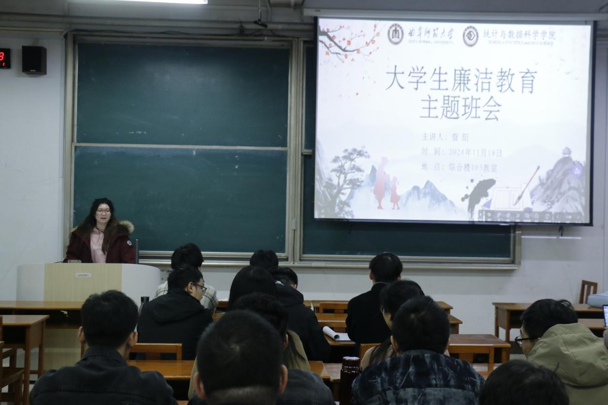 于2024年11月18日19:00在综合楼103室,召开了2024级研究生廉洁教育主题班会。此次廉洁教育主题班会围绕五个主题展开,包括廉洁的内涵与重要性、诚信教育、纪律教育、生活美德和如何做到廉洁。会议由研究生辅导员管阳老师主持,管老师与2024级应用统计专硕班团支书翟伟颖共同主讲,全体2024级研究生参加。