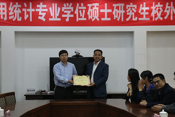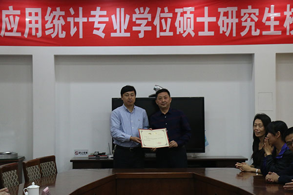 张洪海副校长在致辞中介绍了我校统计学科的学位点建设及研究生培养情况,并对本次受聘的四位教授表示欢迎与感谢。随后,张校长向受聘硕士生导师颁发了聘书。崔凤成和尹强作为外聘导师代表发言,他们在肯定我校统计学院研究生培养质量的同时均表示要尽己所能为应用统计专业学位硕士研究生培养贡献力量。