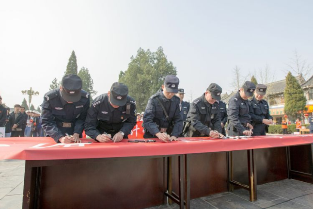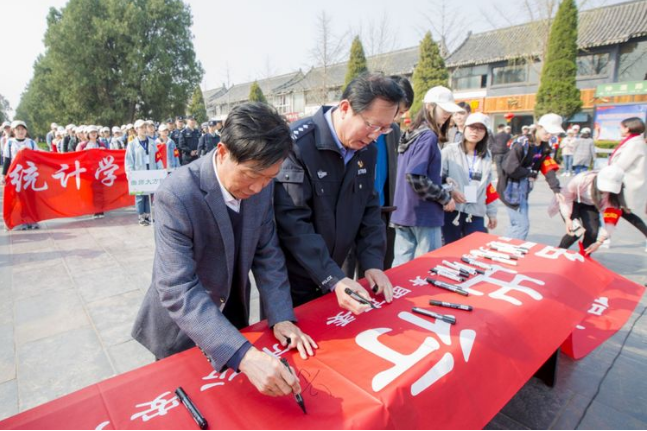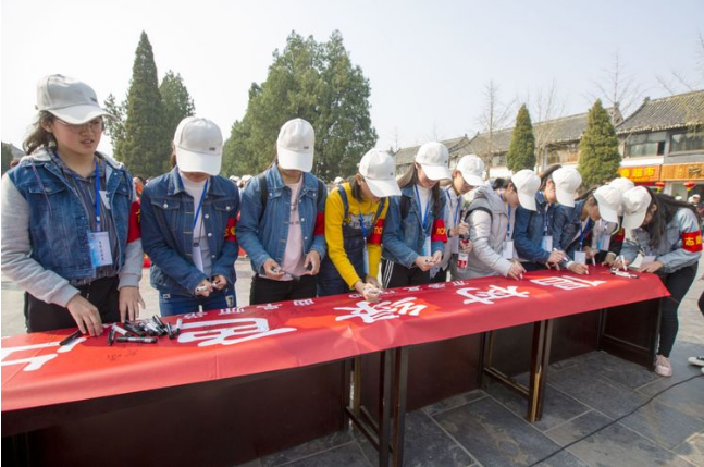 中共曲阜市委宣传部副部长岳耀方和领导嘉宾在活动条幅签字