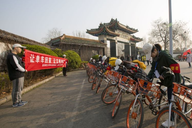 大学生志愿者清洗、整理并摆放整齐曲师大南门的摩拜单车