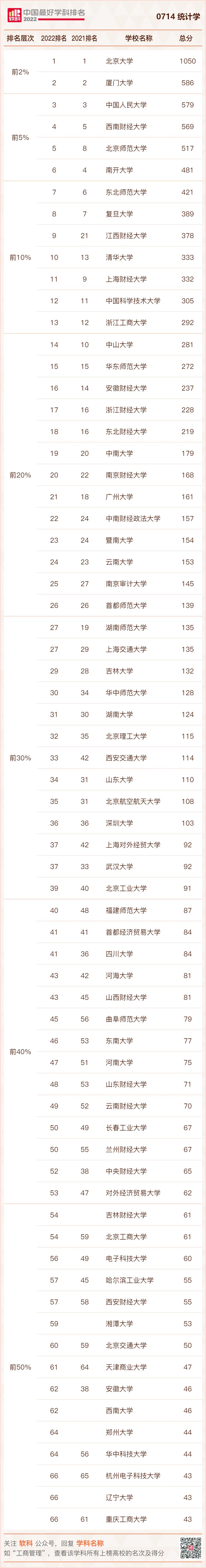 2022年9月21日,高等教育评价专业机构软科正式发布“2022软科中国最好学科排名”。排名榜单包括96个一级学科,各个学科排名的对象是在该一级学科设有学术型研究生学位授权点的所有高校,发布的是在该学科排名前50%的高校。共有484所高校的5035个学科点上榜。其中,统计学学科排名共有68所大学上榜,疯av