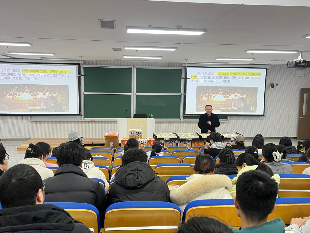 学院党委书记杨正运为考研学子送上鼓励与叮嘱。他强调,学院始终牵挂考研学子的备考状态与成长发展;考研冲刺阶段,心态是制胜关键,同学们要学会调节情绪、劳逸结合,以从容沉稳的状态迎接挑战;同时要坚守诚信底线,严格遵守考试纪律,以诚信应考展现统计学子的良好风貌。